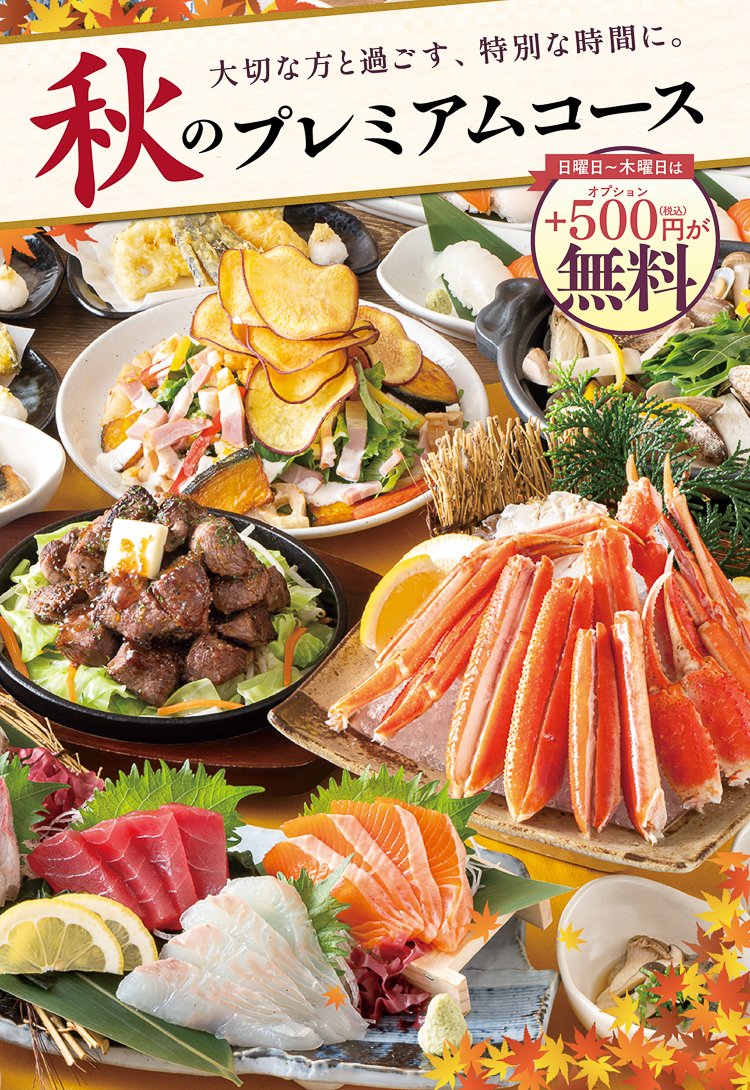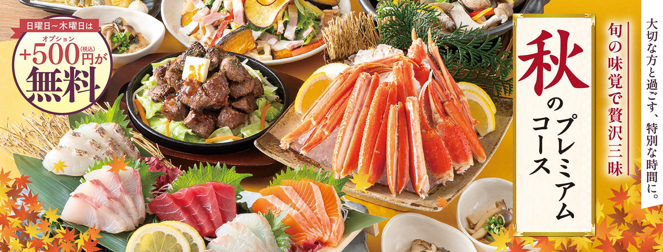 「茹で本ズワイガニ」や「牛ミスジ一口ステーキ」といった贅沢食材をメインに、3種のきのこや秋刀魚など旬をふんだんに盛り込んだ秋のプレミアムコースを4500円からご用意。日~木なら通常お一人様+500円の【飲み放題3時間】or【全メニュー飲み放題】へのアップグレードが無料。4名様以上のご予約で【横断幕】or【寄せ書きボトル】の選べる特典付きです。
