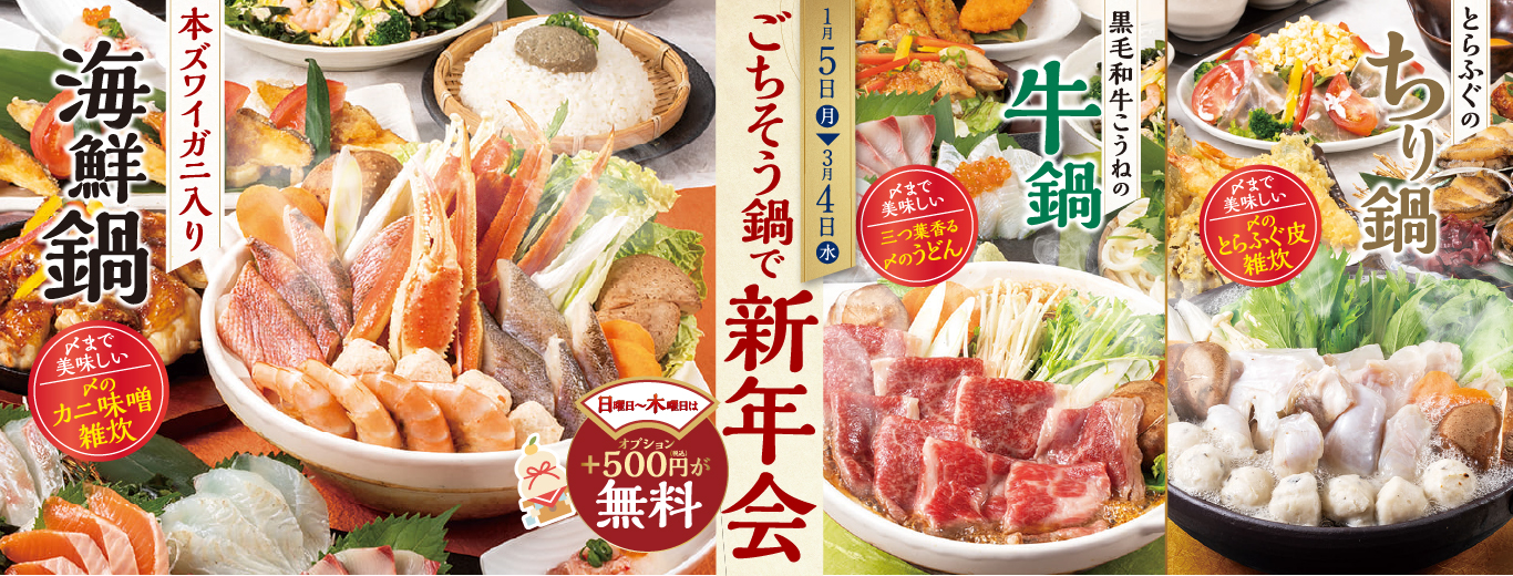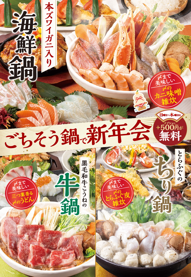 2026年、新年のはじまりは贅沢な“ごちそう鍋”で乾杯!〆のカニ味噌雑炊まで美味しい「本ズワイガニ入り海鮮鍋」、豪華な「とらふぐのちり鍋」、上品な甘みが特徴の「黒毛和牛こうねの牛鍋」がメインの3コースをご用意しております♪
