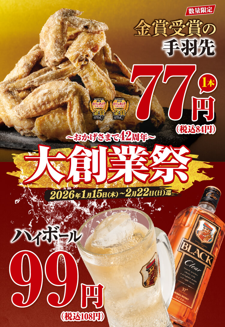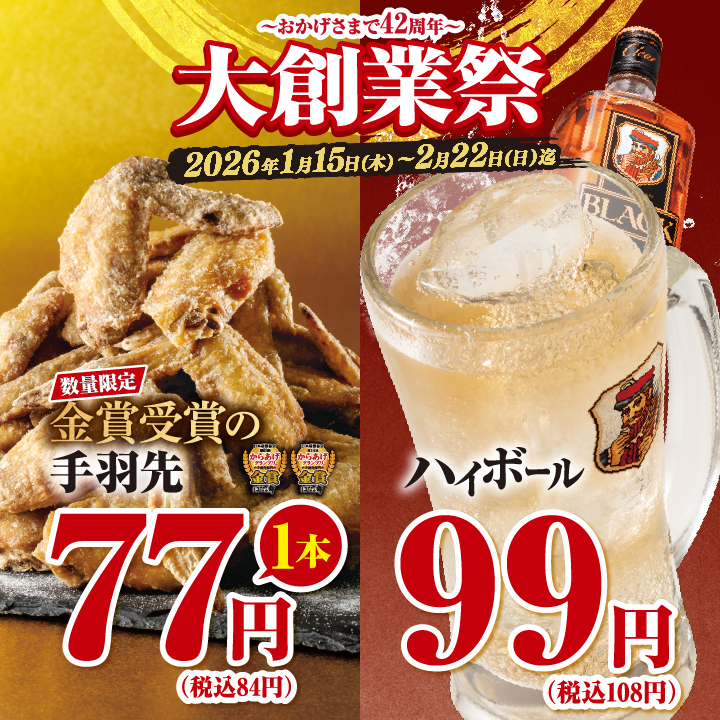 【利用条件】要予約/指定宴会コースご予約に限る/期間中の日~木曜は「飲み放題3hに延長」or「グランドメニュー掲載ドリンク全種飲み放題」の特典が無料/祝日・祝前日利用不可/「2/22・2/23・3/19・4/28・4/29・5/3・5/4・5/5・5/6」は特典対象外/他券・他サービス併用不可