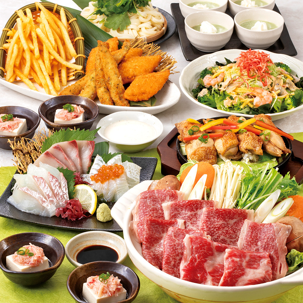 補足事項 | ============================================== ◆選べる感動特典あり◆感動の演出をお手伝い「横断幕」or「寄せ書き焼酎ボトル」 ※【1】もしくは【2】のどちらかをお選びください。併用はできません。 【1】寄せ書きできる焼酎ボトル1本プレゼント! 皆様の思いを寄せ書きにして、オリジナルのボトルをプレゼントしませんか? 4名様~7名様のご予約で「寄せ書き焼酎ボトル500ml(1本)」 8名様以上のご予約で「寄せ書き焼酎ボトル1.8L(1本)」をプレゼント! ※ご利用日の4日前までに店舗へご依頼ください。 【2】横断幕プレゼント! 歓迎会用・送迎会用・誕生日会用・還暦祝用の4種類をご用意させていただいております! 1、「感謝!ありがとうございました!!」 2、「歓迎!よろしくお願いします」 3、「お誕生日!おめでとうございます!」 4、「還暦御祝」 上記4種類からお選びください。 ※4名様以上のご予約で「横断幕」をプレゼント! ※ご利用日の4日前までに店舗へご依頼ください。 ============================================== ご宴会の用途に合わせて 色紙のご用意、花束の購入代行を承ります。 ※詳細は店舗にお問い合わせください。 お昼の宴会・二次会等もお気軽にご相談下さい。 ============================================== ※写真の内容は4名様用でございます。 ※ご予約の時期により、料理内容が変わる場合がございます。 ※食器等が写真と異なる場合がございます。 ※当日キャンセルの場合はキャンセル料を申し受けさせていただく場合がございます。 ※飲み放題のラストオーダーは30分前とさせていただきます。 ※詳しくはお近くの店舗までお問い合わせください。 |
